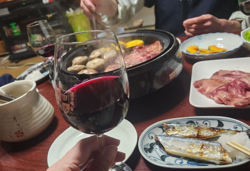 実家ではボジョレーヌーボーを飲みながら牛タンを食べました。